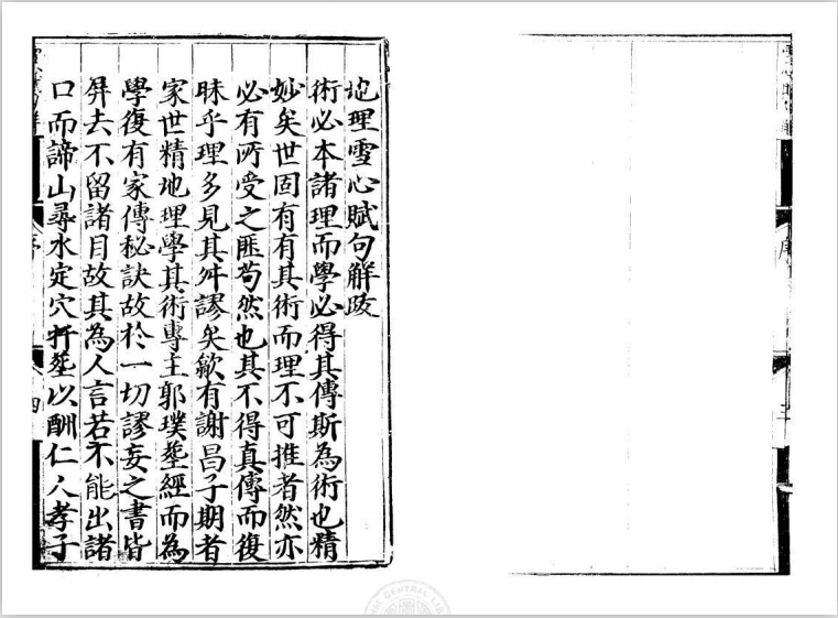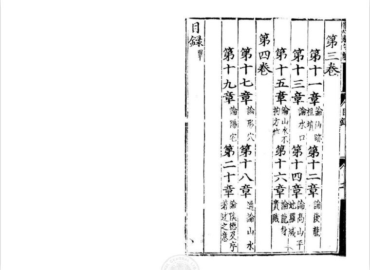 是书共分为二十章,一论地理正宗,二论山水本原,三论气脉分合,四论五星转换,五论水法,六论龙脉行度,七论龙穴真假,八论龙虎,九论葬法,十论克择,十一论仙迹祖坟,十二论后龙,十三论水口,十四论高山平地罗城,十五论山水,十六论龙身贵气,十七论形穴,十八通论山水不拘方位,十九论阳宅,二十论阴德及序著述之意。本次影印,以国图抄本为底本,书法工整,图形完备,允称善本,不可多得!