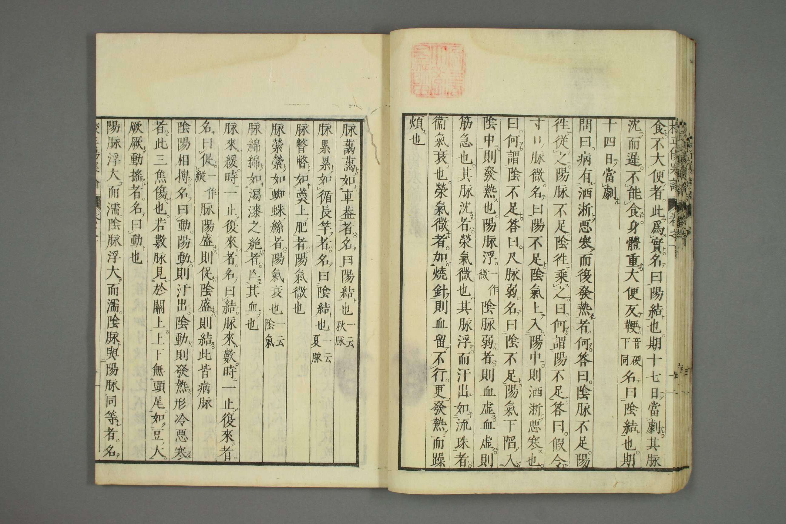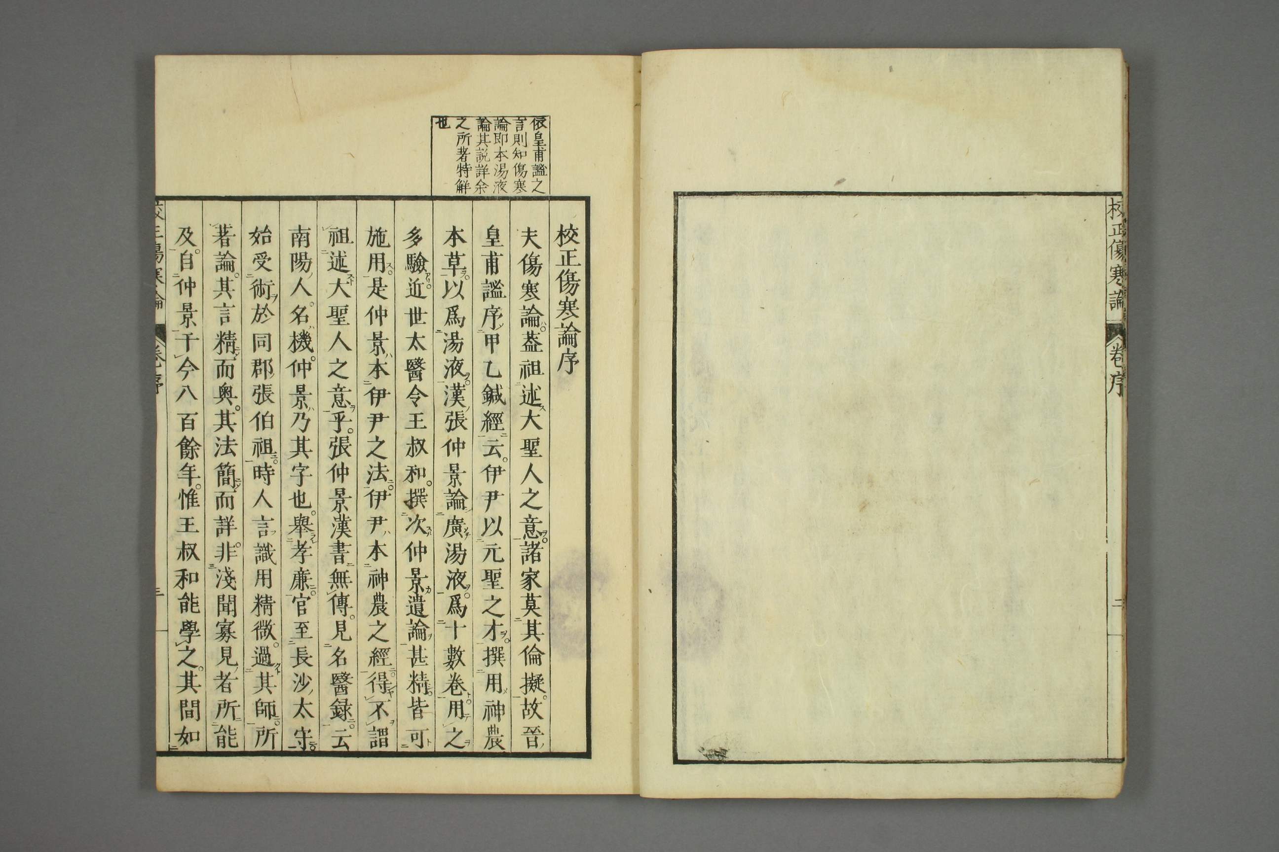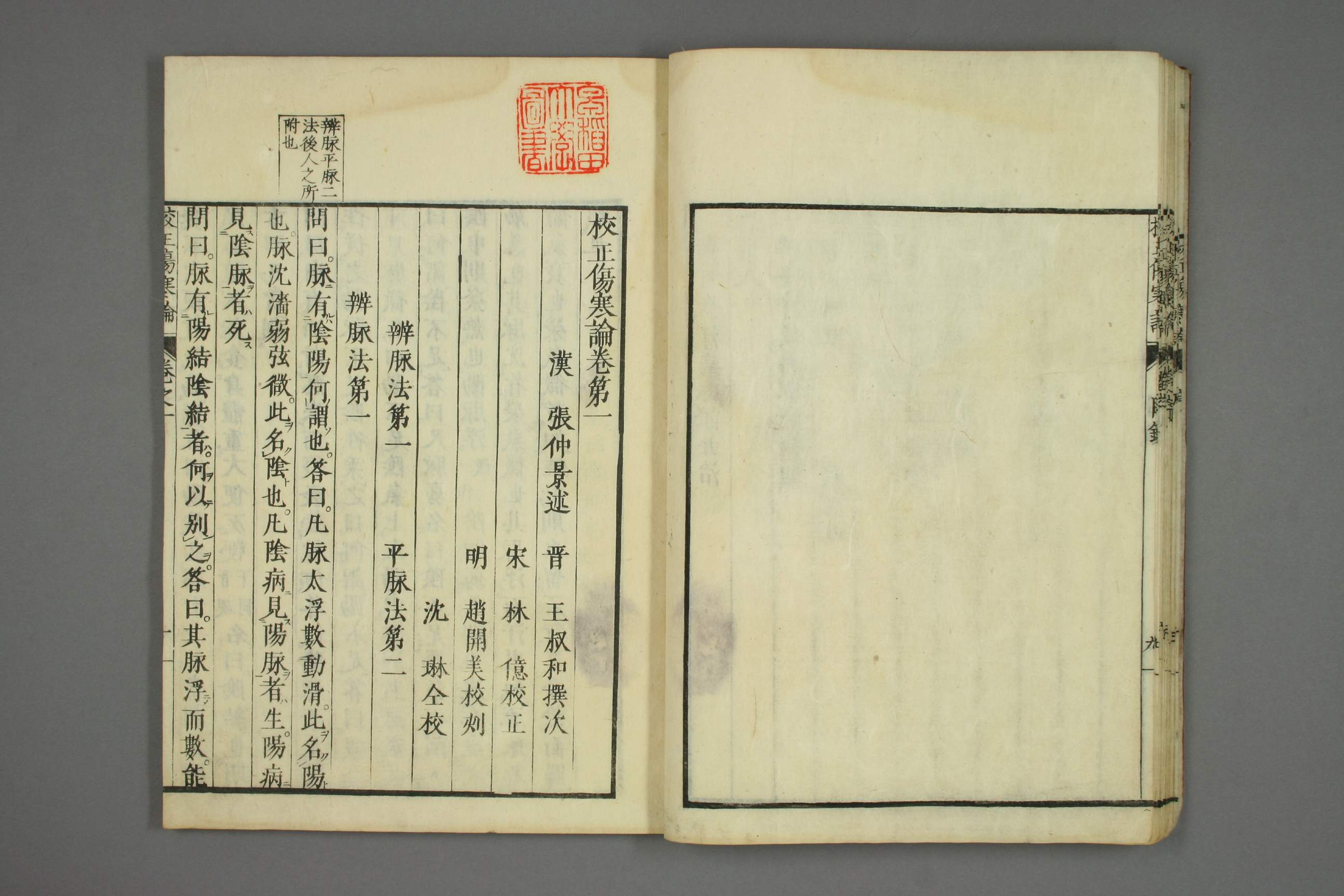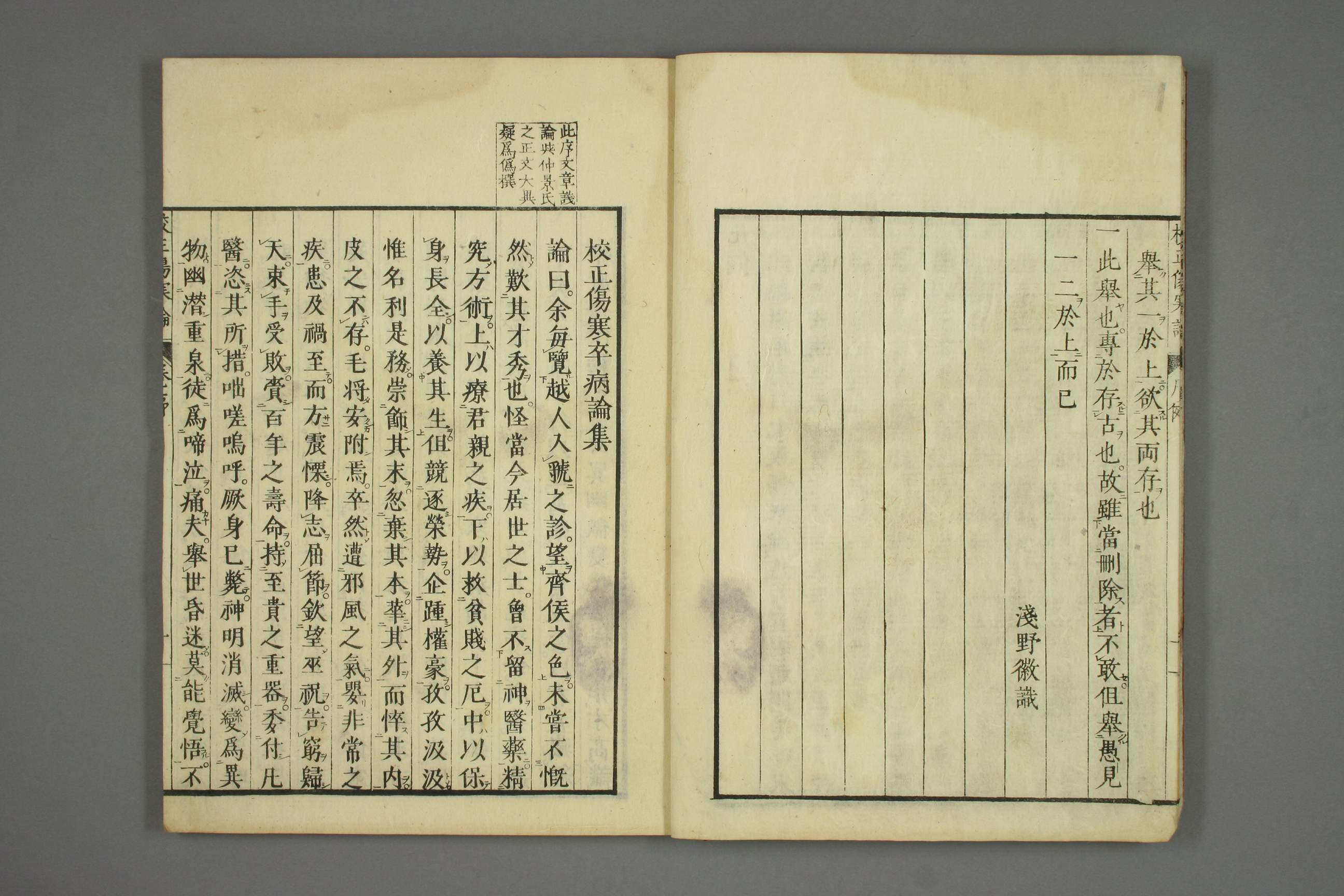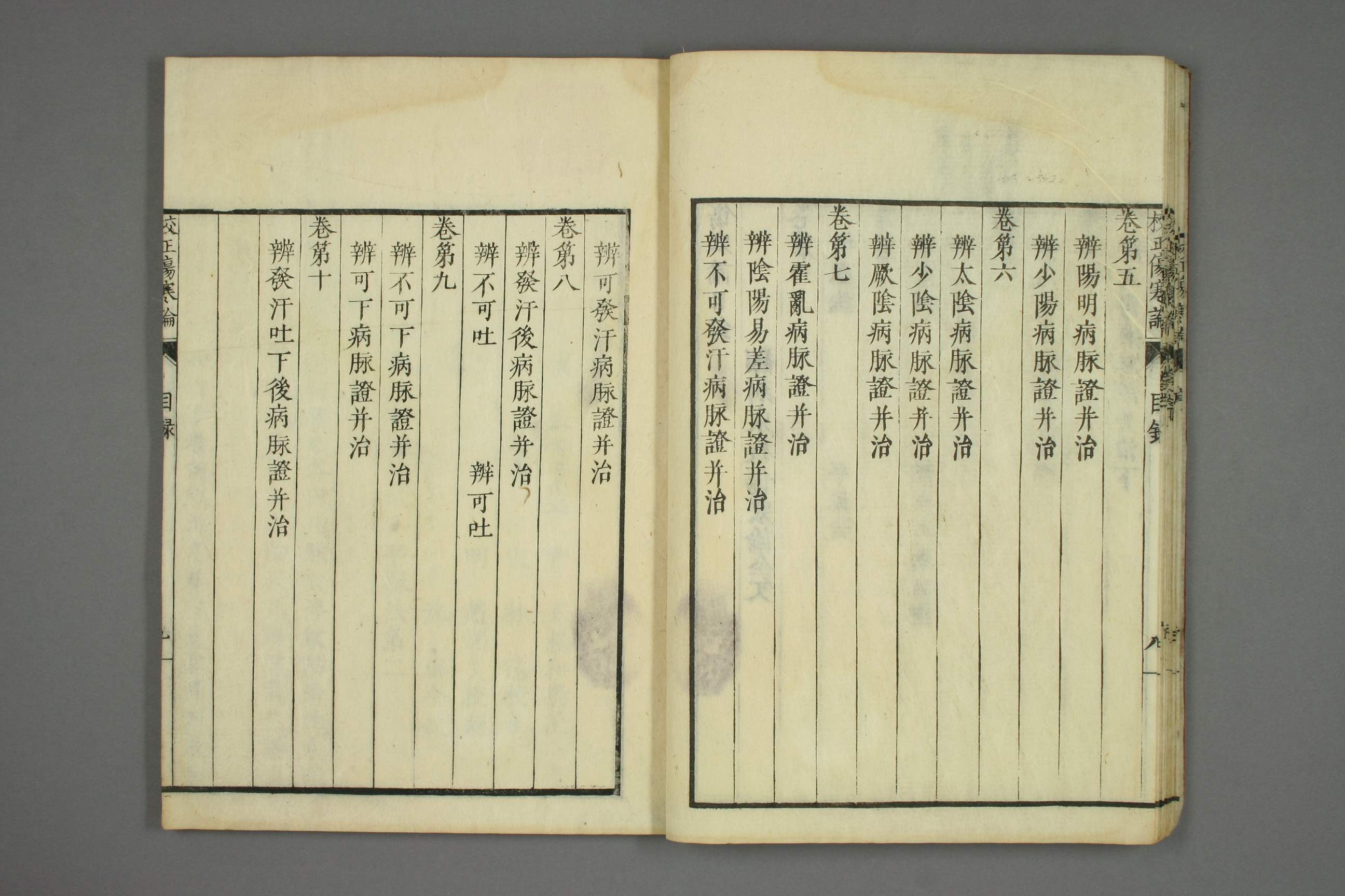 《校正宋版伤寒论》上、中、下三册10卷。汉张仲景著,晋王叔和撰次,宋林亿校正,浅野徽宽政丁巳(1797)题凡例。全书共144个筒子页,合计288页。