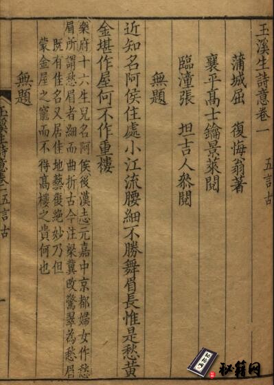 正文卷端题额题「玉溪生詩意卷一」,下署「蒲城屈復悔翁著,襄平高士鑰景萊閱,臨潼張坦吉人參閱」