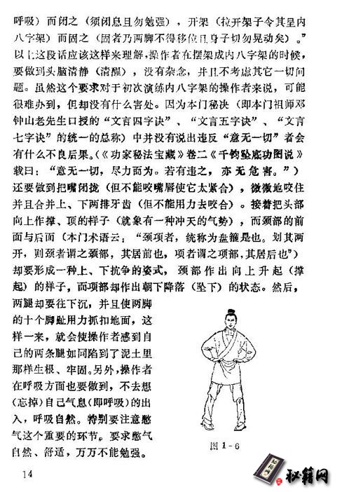 于钧坠底功,共有八个定型摆成“桩式”的固定架子(即动作)。当年(即十年前)在整理《功家秘法宝藏》卷二硬形气功类《千钩坠底功图说》中,作者就仔细端详、研究过“八大功力全像做架精图”。这是八幅绘有八名中年乾(即男性)道衣冠楚楚、右手持握弹尘并指左臂之上、拉架摆出八个不同造型动作的绣像。它们分别示意了于钧坠底功中“八大架”,的主要(关键)姿式。另外,在每一幅绣像的四周,都标有文字相同的“四字诀”。