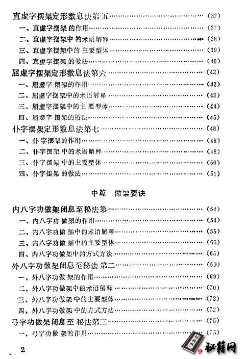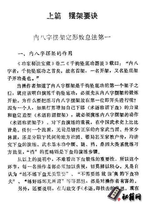 其诀云:“坠底八架,谓之硬形。硬做下坠,坠而固之。提劲捺气,托物(一名托械)助之。八架演毕,神力顿生。千斤之力,万力难起。两腿晃动,陷地过膝。”上述“四宇诀”中所表示的含义是,千钩坠底功的全盘完整功法共有八个架子,即“坠底八架”之说。这八子架子归类于内家武当派太和门(又名功家南派)中四大功种之一的硬形气功范畴,即谓之硬形之说。这些硬做的架子使操作者身体的重心下移,按本门术语解译(释)则为“底盘坠园”(即两脚心的双涌泉穴定气稳固),而操作者运起功力并且把自己的内气往下盘(即人体下部髋骨头以下)强力下降,还要借助于托物(即特制的做架器械)来进行。待到所有的架子,即“八大架”演练完毕,便能够使操作者产生出神奇英测的巨大力量。这千斤之力,是其它任何力量也难以比拟的。另外,使出千钓坠底功时,只要把两腿作晃动状,便可令自己的膝部陷进泥土地内。