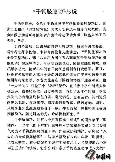 据作者之师李松如、李钟奇两位老先生讲述:“千钩坠底功的全盘完整功法,即“八大功力图’(系八套演练千钧坠底功的图说总谱)演练完毕后,可达到两腿晃动、陷地过膝的功效。如吾师李老六,清成丰年间官任两江总督制台门武将军。某日,外地有名拳师两人率八十余名习练武艺者来江宁府相访并与该地圈内行家交手。李老六先生在下浮桥的洋钱厂迎战对家。他“一夫当关’,只拉了个‘马档’架子,且任数十名纠纠武夫轮番出手,或拳脚相攻,或刀棒夹击,直打了近半个时辰,李老六先生仍自始至终神色自若,毫无惧色,更有甚者,其两腿竟然陷入泥地,深及膝盖,围攻者惊疑万状,噤若寒蝉。斯时,只见李老六先生忽地将身子一纵,冲天而起,并带得泥土碎块四溅纷飞,随之矫若游龙,吟啸拂柚而去。”
