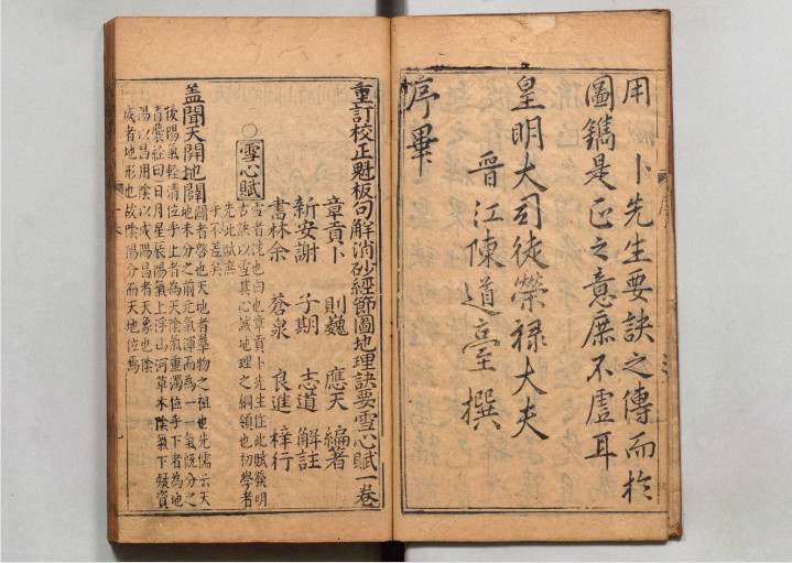 《雪心赋》系唐朝卜应天所著。卜氏字则巍,号昆仑子,又称濮都监。卜应天世居赣州,荐太史不就而入道门,为黄冠师。因自许“心地雪亮,透彻地理”,因而将其著作取名《雪心赋》。《雪心赋》是峦头名篇,先贤有云:“地理诸书,世传充栋,求其术臻神妙者,而古籍《葬书》为最;理极深悉者,而《发微》为优;欲知作法之详活,无如杨公之《倒杖》;欲识星形之异态,无如廖氏之《九变》。至若星垣贵贱,妙在《催官》;理气生克,妙在《玉尺》,数者备而峦头、天星尽是矣!《雪心赋》词理明快,便后学之观览,引人渐入佳境。” 《地理诀要雪心赋》,明刻本,全称为《重订校正魁板句解消砂经节图地理诀要雪心赋》,署章贡卜则巍应天编著,新安谢子期志道解注,书林余苍泉良进梓行,是一个对《雪心赋》进行详图注解的重要版本。