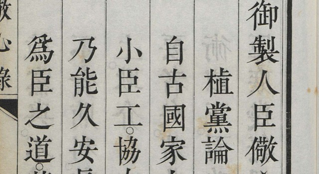 《御制人臣儆心录》是清顺治皇帝御撰。共八篇:植党论,好名论,营私论,徇利论,骄志论,作伪论,附势论,旷官论。大致概括了历代奸臣作恶不法的方方面面。书前有御制序。此本约刊行于清顺治12年(1655),此套本分为两册:汉文,满文本各一册。