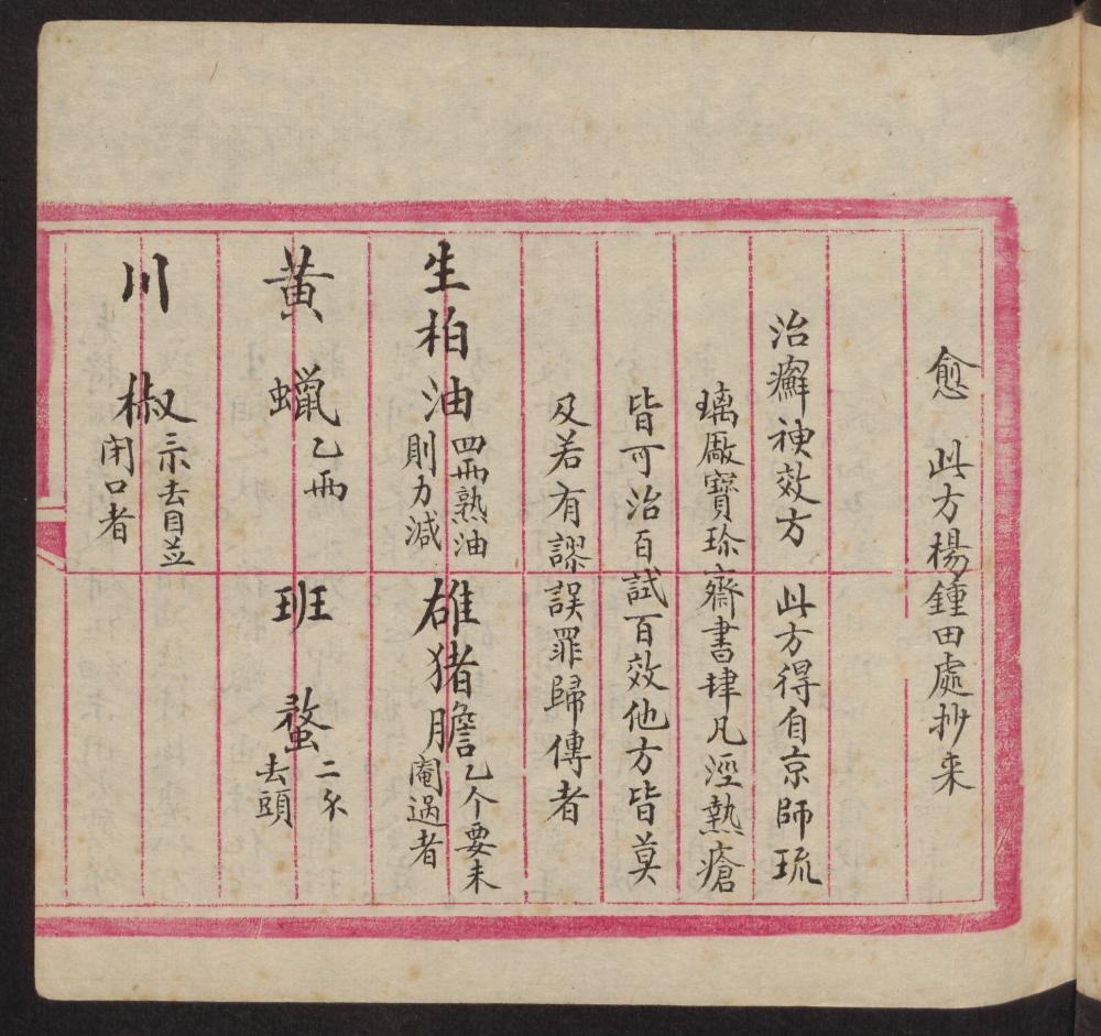 本书收录了诸多古方,包括:治疟疾仙方、治喉痛方、治癣神效方、治时疫方、治哮吼妙方、洗眼仙方、治目疾方、治折骨伤方、治疝古方、治擦牙方、治蛇咬蜂蛰、治疝气方、治鼻血方、治鱼骨鲠、治失血方、治扑打跌伤、治接骨、治咽食倒食方、治痞块方、治喉闭症、麝黄散(治牙痛喉痛)、人中散(治诸般牙痛喉痛)、解暑妙方、蛛丝迷目方、鼻疔方、小脚方、跌打损伤刀伤历时止血止痛奇方、治诸骨鲠、治癫狗咬方、治麻脚瘟慰肚方、辟疫方、治吐血神方、治痢症神效方、治疥疮方、治疯犬咬伤仙方、鼠疫神妙方、治羊毛疔方、调经种子仙方、治使耳聪方、治跌打损伤刀枪马踢伤、戒酒新法、火伤疗法、飞马取疔丹、治蟲牙方、治火牙方、神效开骨散、保生无忧散、预治小二惊风、出生小儿开口方、小儿封脐方、治小儿出生脐风秘方、治产妇胎衣不下、治痘方、白带丸方、九味健脾散、陆氏保胎神效膏、种子奇方等!