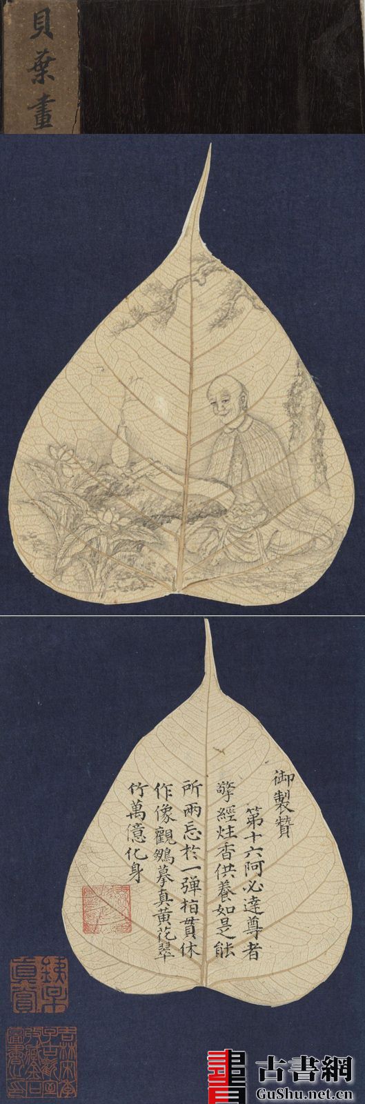 古籍.贝叶画罗汉并书赞.十六罗汉.书绘于菩提叶.古欢宝藏.1850年丨十六罗汉图赞.册页.清乾隆时期内府.泥金绘本