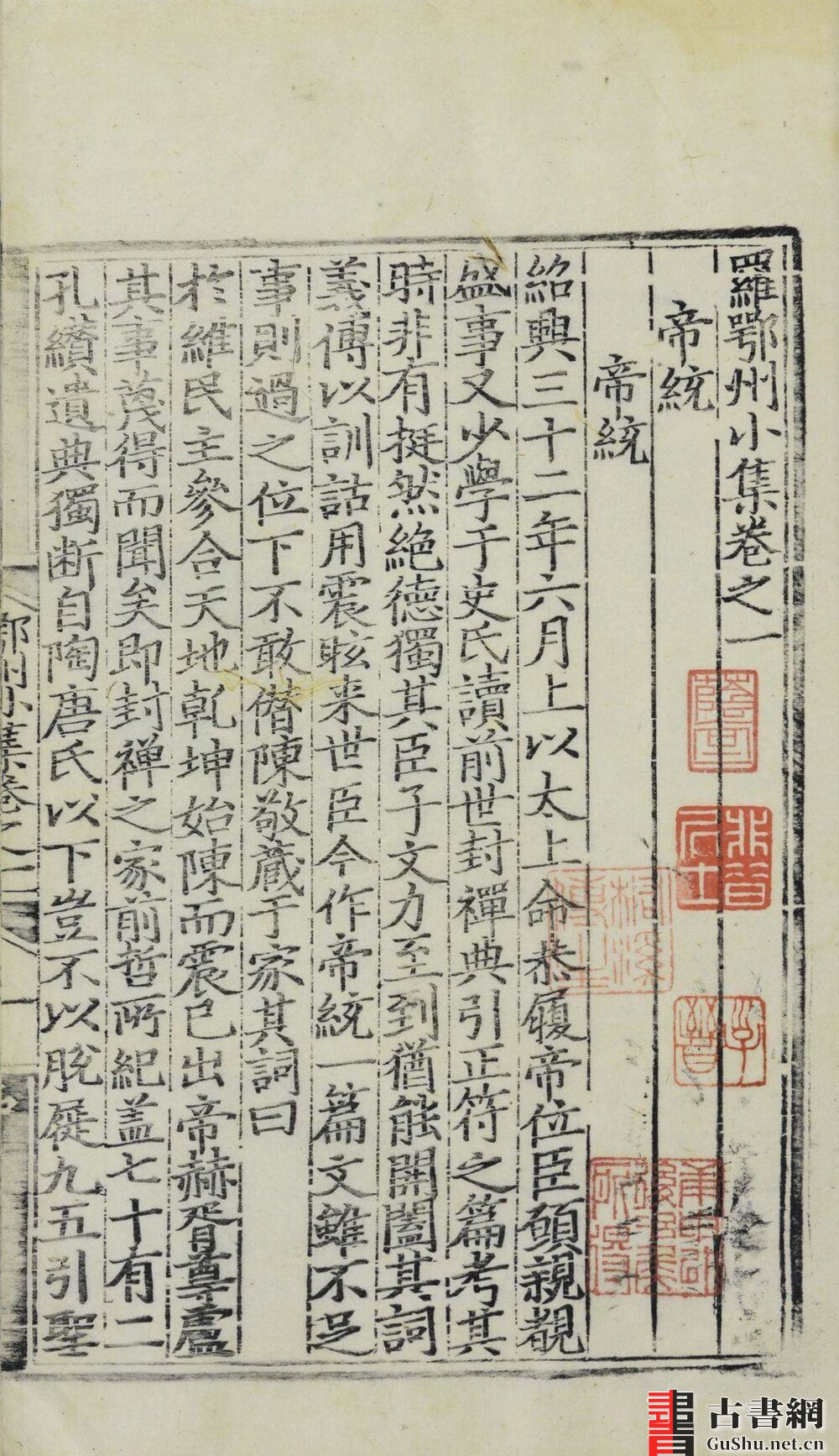 此《罗鄂州小集》为南宋罗愿所著诗文集。全书含正集五卷,分为帝统、辞赋、诗歌、论说、序记、行录、碑铭、题跋、札子、表笺、书启等类别。后附其弟(罗颂)罗郢州遗文一卷。此为香港中文大学图书馆藏明洪武二年罗宣明刊本。