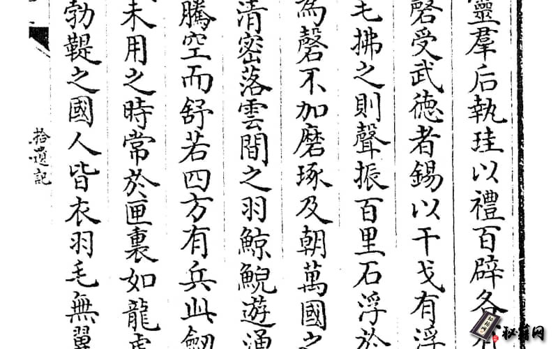 《拾遗记》共10卷。前9卷记自上古庖牺氏、神农氏至东晋各代的历史异闻,其中关于古史的部分很多是荒唐怪诞的神话。汉魏以下也有许多道听途说的传闻,尤其宣扬神仙方术,多诞谩无实,为正史所不载。末1卷则记昆仑等8个仙山。《拾遗记》的主要内容是杂录和志怪。书中尤著重宣传神仙方术,多荒诞不经。但其中某些幻想,如“贯月槎”﹑“沦波舟”等,表现出丰富的想象力。文字绮丽,所叙之事类皆情节曲折,辞采可观。后人多引为故实。如第6卷记刘向校书于天禄阁,夜有老人燃藜授学;贾逵年5岁﹐隔篱闻邻人读书后遂能暗诵六经。这两则传说即很有名。
