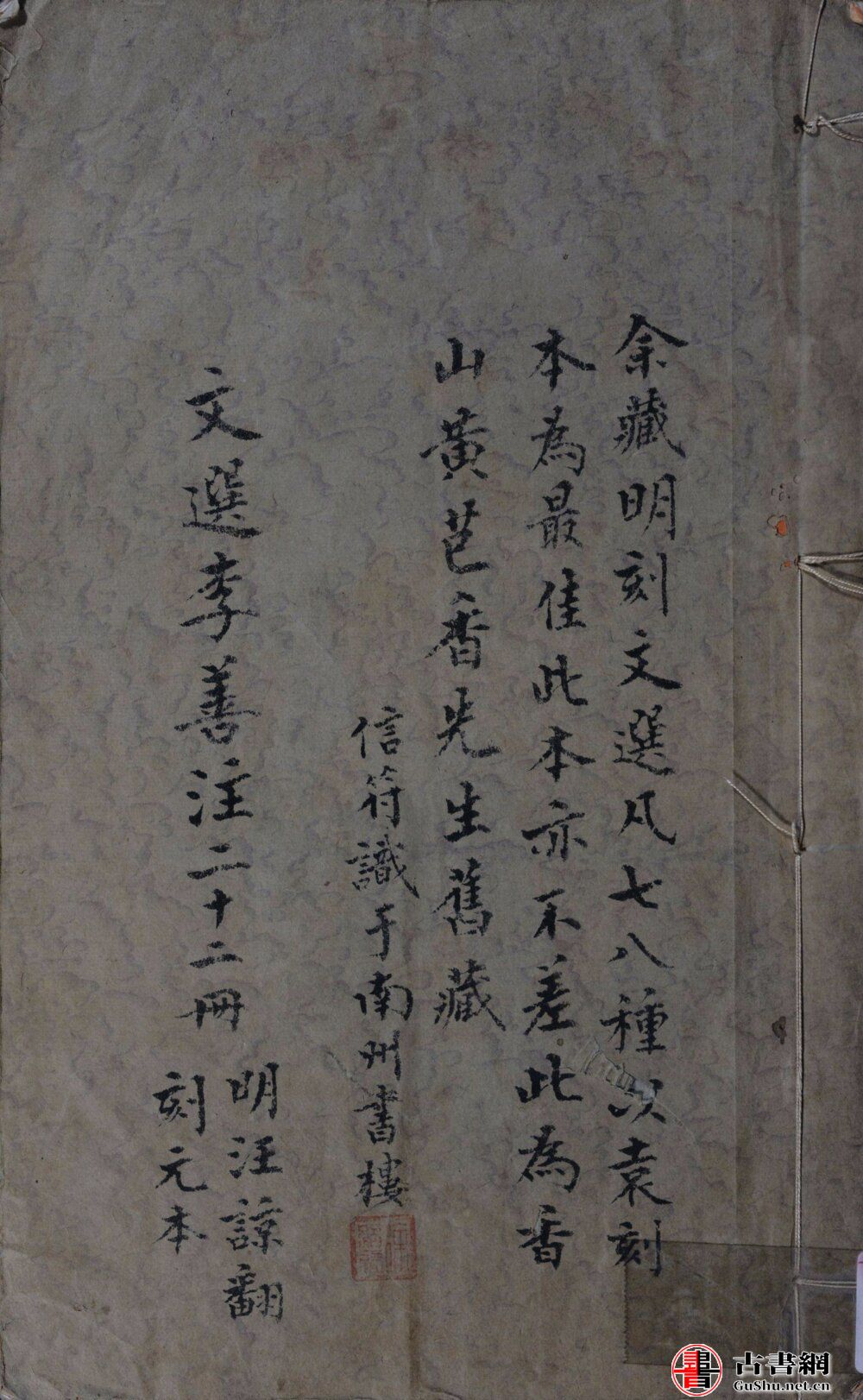 古籍.文选. 六十卷. 南《文选》是中国现存的最早一部诗文总集,由南朝梁武帝长子萧统组织文人共同编选。此《文选》由唐李善注,全书共六十卷,选录了先秦至南朝梁代八九百年间、一百多个作者、七百余篇各种体裁的文学作品。此为明嘉靖元年金台汪谅校覆刊元张伯颜本,书前目录后有书目广告(已知最早)一则。《文选》又称《昭明文选》,因萧统死后谥 “昭明”,所以他主编的这部文选称作《昭明文选》。一般认为,《昭明文选》编成于梁武帝普通七年(526)至中大通三年(531)之间。在这部总集里,萧统把我国先秦两汉以来文史哲不分的现象作了梳理和区分,他认为经史诸子都以立意纪事为本,不属词章之作,只有符合 “事出于沉思,义归乎翰藻” 的标准的文章才能入选。也就是说 ,只有善用典故成辞、善用形容比喻、辞采精巧华丽的文章,才合乎标准,《昭明文选》正是以此来划分文学与非文学界限的第一部选集。(介绍参考)