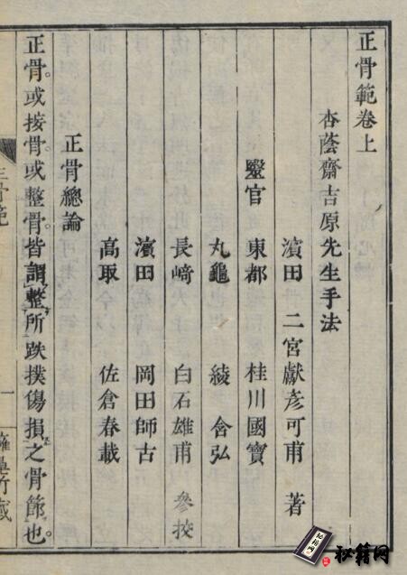滨田医官二宫彦可博学笃志,精于其业。曾西游至于长崎,师事吉原杏隐,得正骨之术。杏隐原武夫也,扩充其曾所学死活拳法,以建其法。彦可尽传其秘蕴,东归之后,屡验诸患者,桴鼓相应,十愈八九,遂以良闻。顷原其师说,加之以其所自得者,著《正骨范》二卷,请序于予。予阅之,其书探珠、弄玉、靡风、车转、圆旋、螺旋、跃鱼、游鱼、熊顾、鸾翔、鹤跨、骑龙、燕尾、鸰尾、尺蠖诸法焉,母法十五,子法三十六,合五十一法矣。有图而象之,有说而解之,又别建揉法百五十法焉。富哉术也!比诸《金鉴》诸书所载,则犹金罍玉爵之于污尊抔饮耶。杏隐海隅隐士,怀抱奇术,遁戢不出,销名幽薮,然得彦可而显于天下,岂不为大幸乎?今之医生匿其师传,以为自得,栩栩夸人,钓誉于世,以戈身家之腴者,比比有之,甚则至弯射羿之弓焉。彦可则不然,著其书而显其师,比诸彼徒,岂不亦天冠地履乎?予于此书,不独喜其术之精,而有青蓝之誉焉,又以喜意出于敦厚,慕君子长者之风者乎!