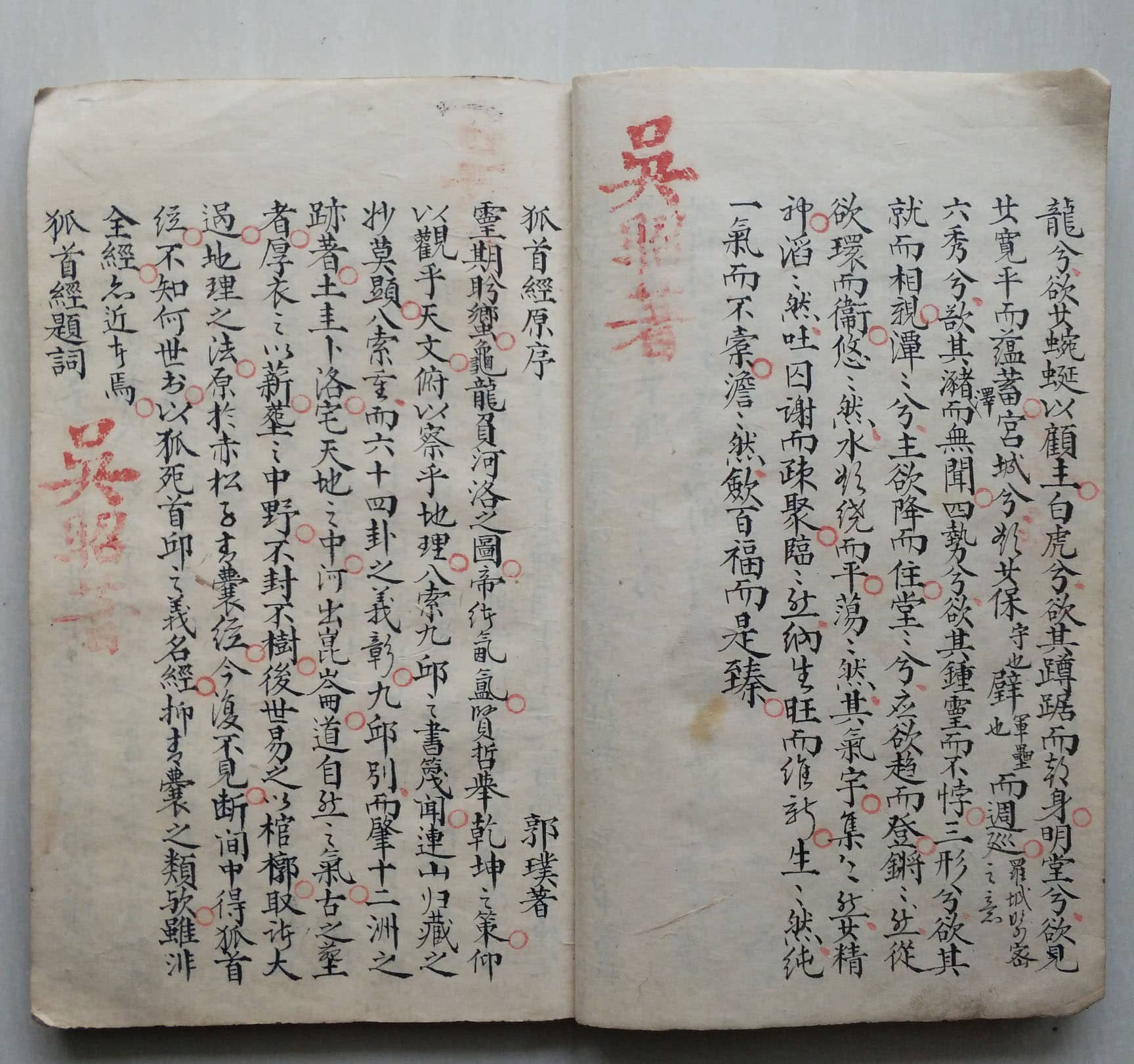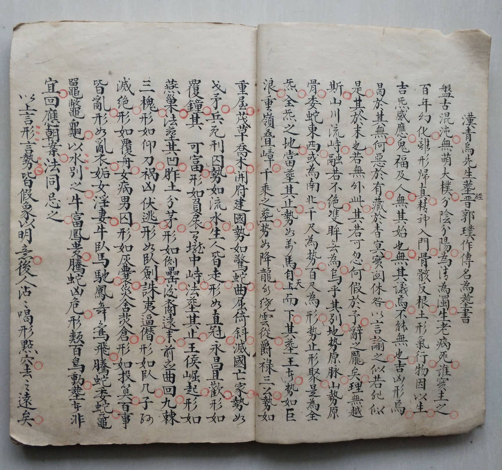 《地理正宗青囊老传》,(清)吴昭著,陈卷山子珍藏手抄本。内容包含:古青囊老传、古玄女三字青囊经、古青乌子青乌经、后汉管辂指蒙正义、郭璞狐首经、晋郭纯塟书、寻龙要诀、峦头九星正变、穴法纂要、识龙说、穴法说、砂诀说、善恶水论、分合说、斗临赋、游星濬源、金光斗临经、唐杨曾经序、明蒋大鸿氏辨正等。全书共59个筒子页,合计118页。