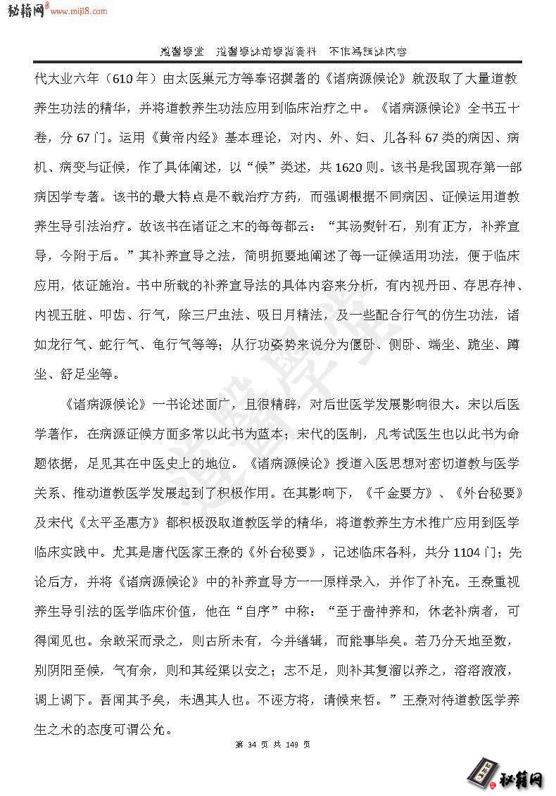 正是在这一宗教与医学相互交融的历史过程中,道教医学得以逐渐产生,并经过汉魏两晋南北朝道教名士对传统医学不断融摄与创发,初步形成了中国传统医学的一个流派。就其历史渊源而言,道教医学的源头可以远溯道原始宗教之巫术医学,而他的直第7页共149页