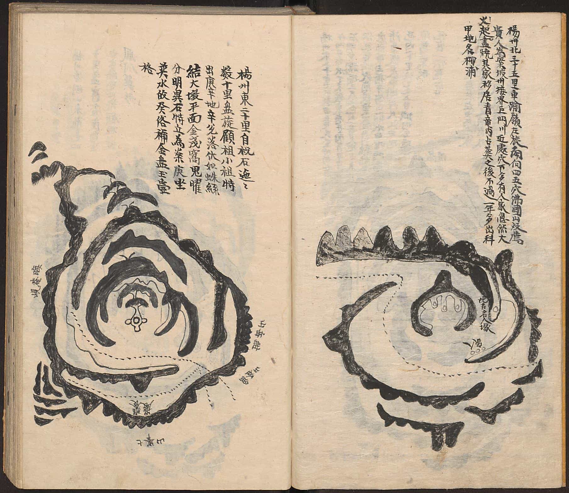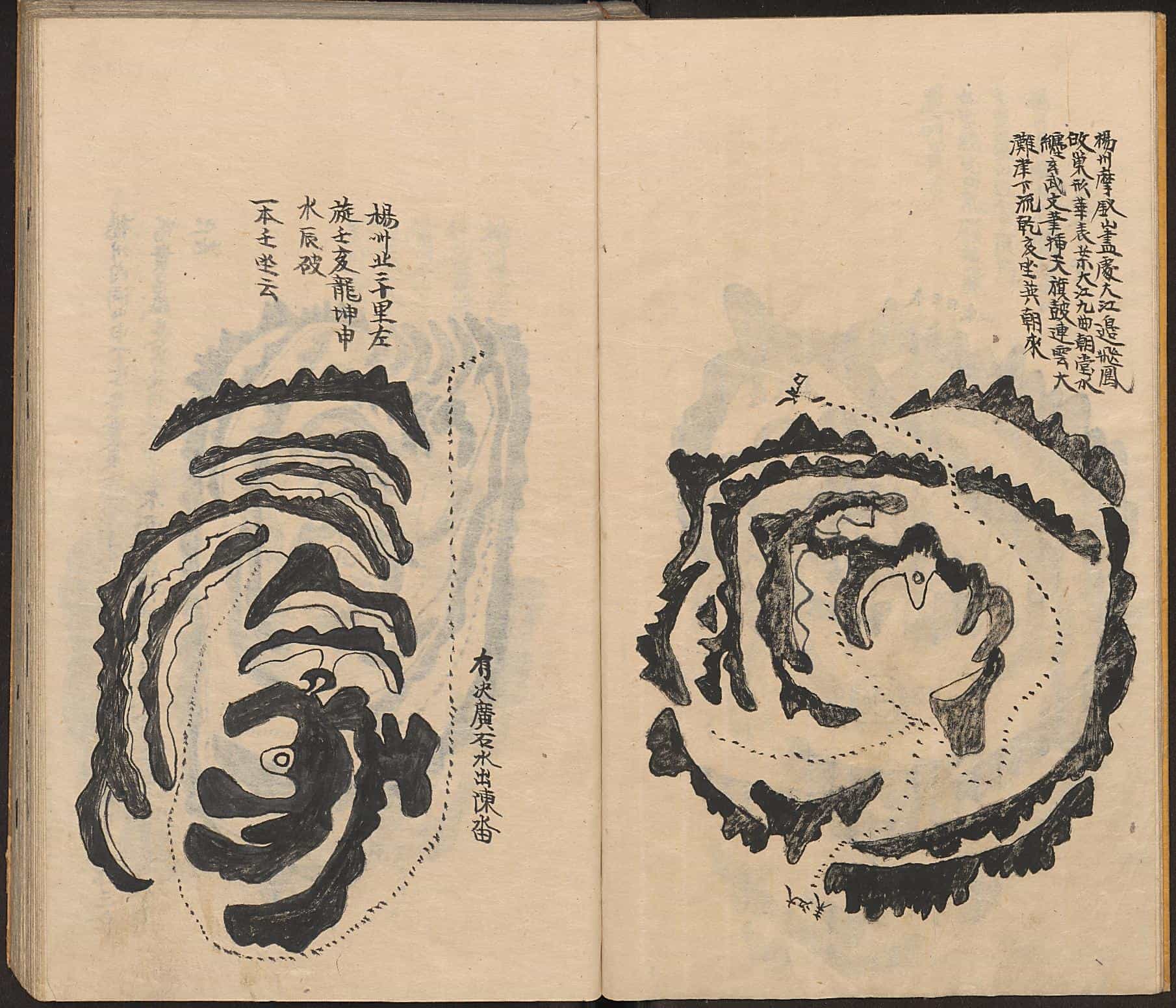 图形中,黑色区域是山脉,虚线表示水流。山脉上写有主要山峰的名称,有时沿着虚线水线写有“水口”、“来”、“去”等术语。岩石等用单线表示,并用“石”标记,“田原”表示田地的存在。偶尔会看到丙、午等指示方向的符号,表示二十四方位中的具体方向。
