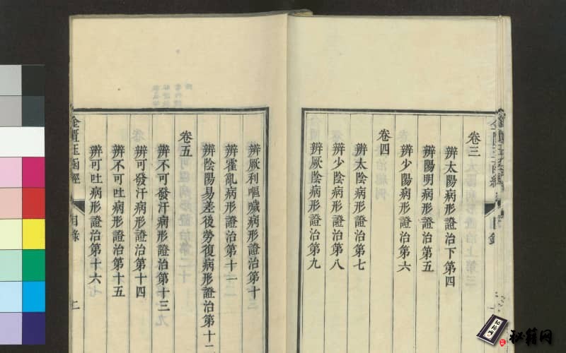 其中卷一为证治总例;卷二-四为库、湿、喝、辨脉、六经病、厥利、呕喽、香乱”、阴阳易、差后劳复等病证;卷五-六为汗、吐、下、灸刺、水等治法的“可”与“不可”及热病阴
