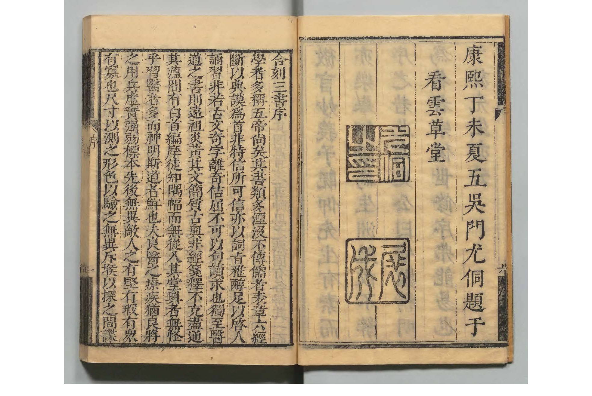 《士材三书》6册,清康熙38年刊本,先医书院藏版,作者明朝李中梓(士材),包括《诊家正眼》三卷、《本草通元(玄)》二卷、《病机沙篆》二卷,后附《寿世青编》二卷。全书合计550个筒子页(双面)。