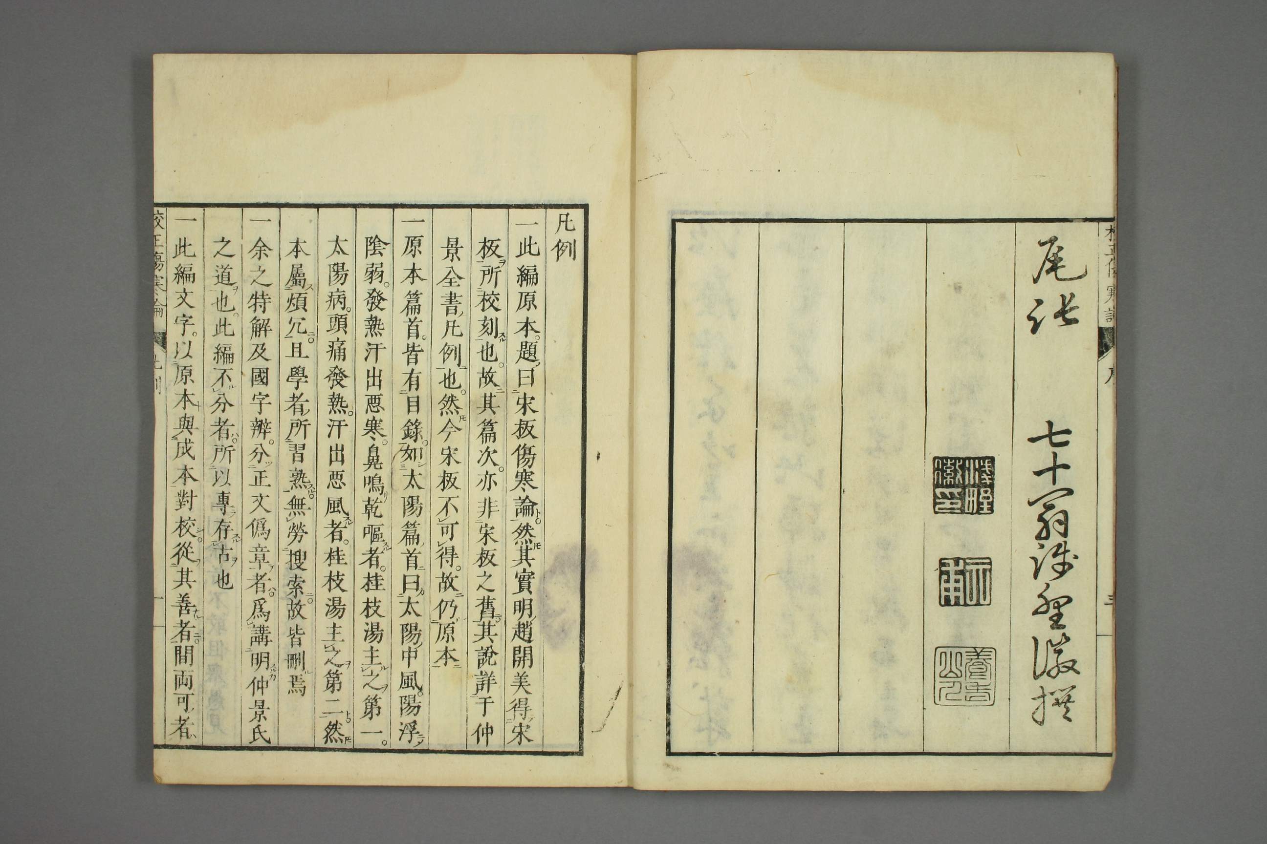 《校正宋版伤寒论》上、中、下三册10卷。汉张仲景著,晋王叔和撰次,宋林亿校正,浅野徽宽政丁巳(1797)题凡例。全书共144个筒子页,合计288页。