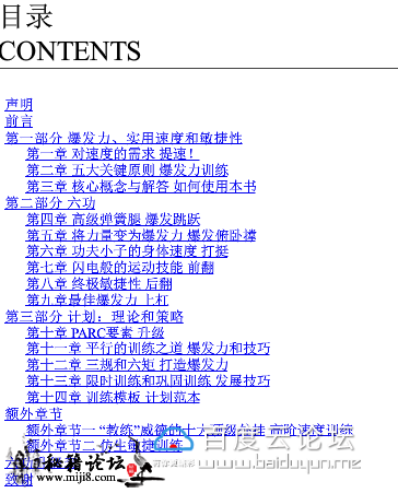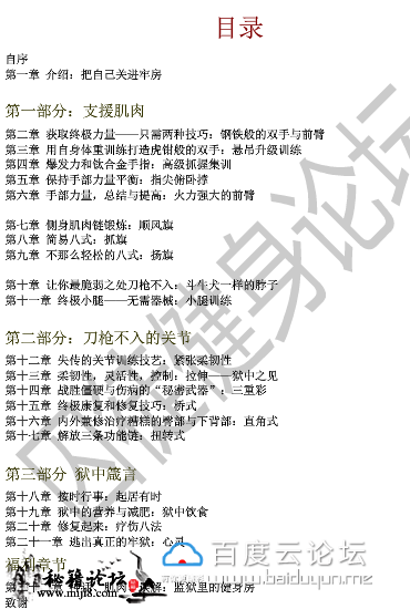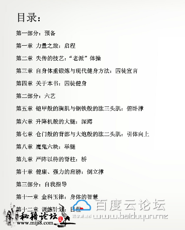 封面及目录截图 在线面哦 !!! 介绍: 这不是一本教你练出“可爱肌肉”的书,而是一本教你练出能用的力量、极限的力量、生存的力量的书。作者保罗·威德在美国最严酷的监狱中 度过了19年,在其中逐渐挖掘出了一套最古老的健身法,在商业社会中早已失传的力量哲学,并凭此成为了地球上最强壮的人之一——这让 他 得以有尊严地生存下来。出狱之后,他把这套失传的技艺整理并公之于世——这是他带给我们的最珍物。 生存下去,至少要有:钢筋铁骨的双手及前臂,守护脑袋的终极脖颈,永动机般的小腿,无懈可击的侧链肌肉,刀枪不入的关节,越受伤越强大 的自愈力。