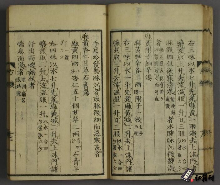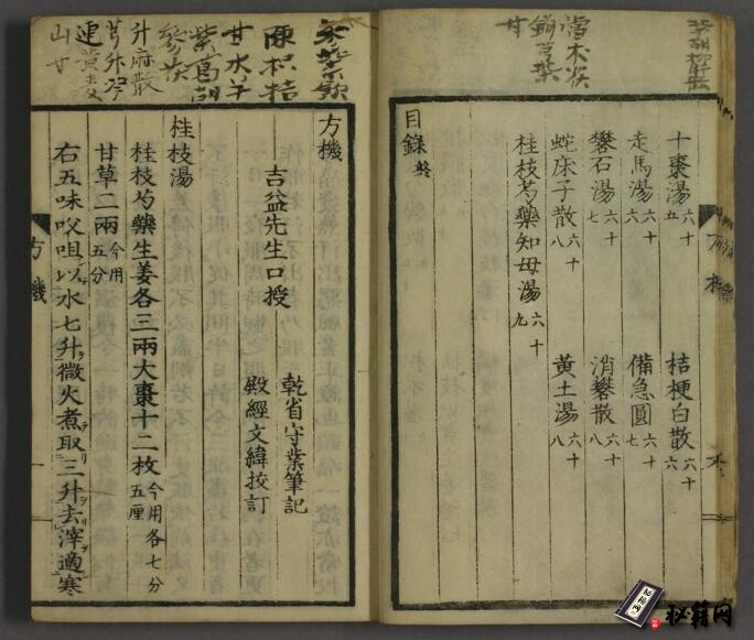 不分卷。日本吉益为则(字东洞、公言)撰,日本乾省守业编辑。成书于日本文化八年(1811)。又名《古方兼用方机》。其收录的一百二十四首方剂,大部出自《伤寒论》、《金匮要略》两书。书中以方统证,每方后列主治、变证及禁忌证等内容。方末附有汉代药物剂量与日本当时药物剂量的换算,其方中所用之药物剂量,亦为仲景书中之剂量。现存版本见于《皇汉医学丛书》。