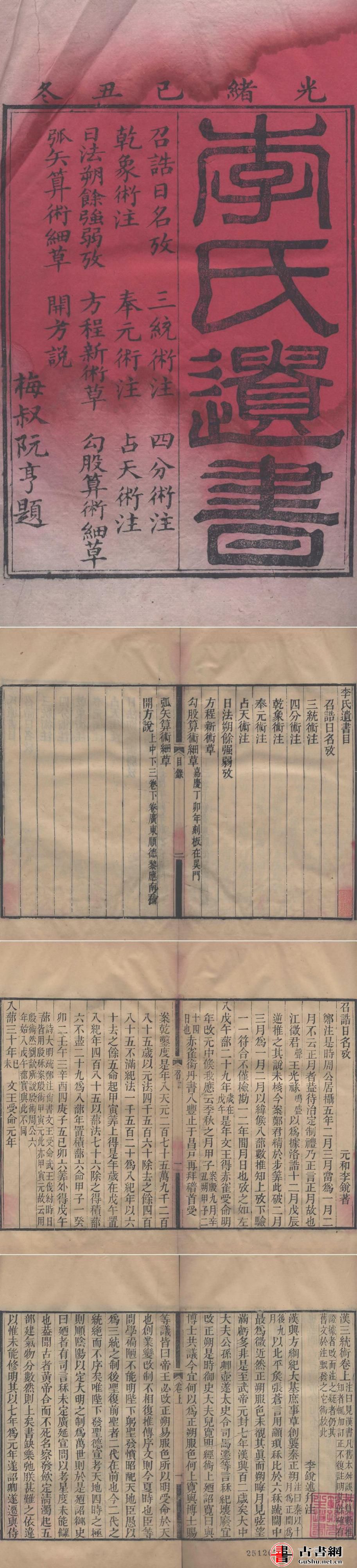 《李氏遗书》,一名《李氏算学遗书》,是清代中叶李锐的天文、数学著作集。该书初刊于嘉庆年间,集中若干卷末有 “仪征阮福校”、“甘泉老友江藩校” 等字样,系李锐去世后由其友人及弟子编集而成。除了嘉庆年原刊本外,此书尚有道光十三年 (1823)、光绪十五年 (1889) 和光绪十六年 (1890)3 种重刊本。