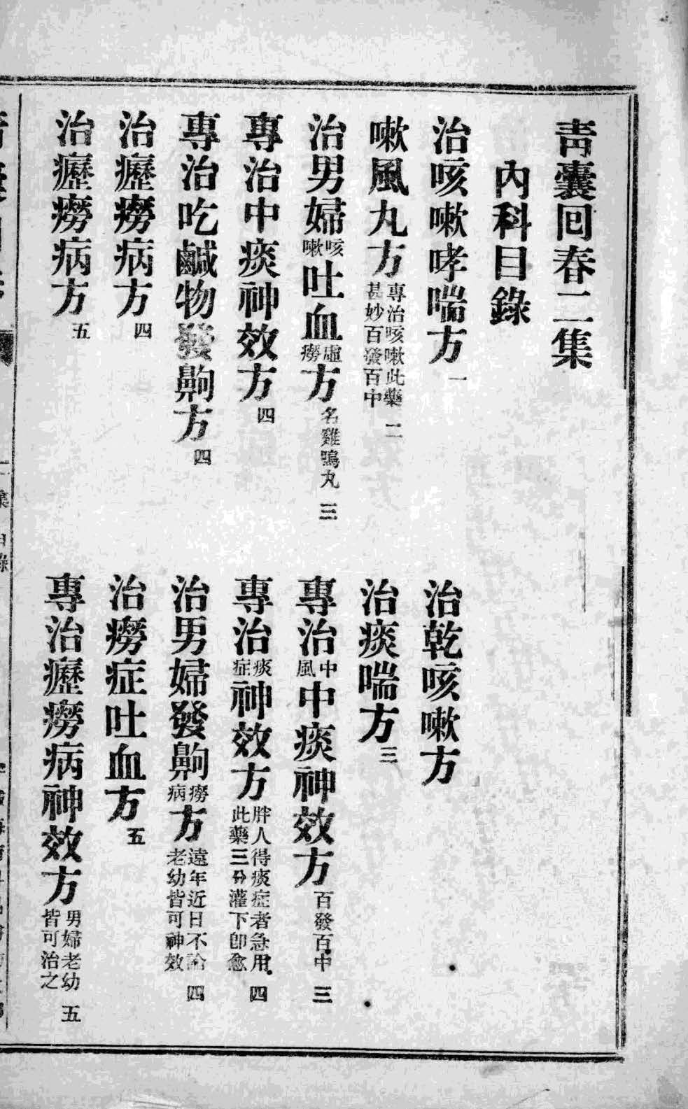 《青囊回春》,书作者不详,此版本为民国刊本,汇辑了外科、内科、妇科、儿科共怪方、奇方、验方等,由于传本较少,故而愈加神秘。其中含大量的医学古秘方。 而方剂大多为,李频湖,王淑和,叶天士,张仲景等古典验方,大量神方仙方,许多秘方久以失传,难得一见。全书共两卷,合计424页。