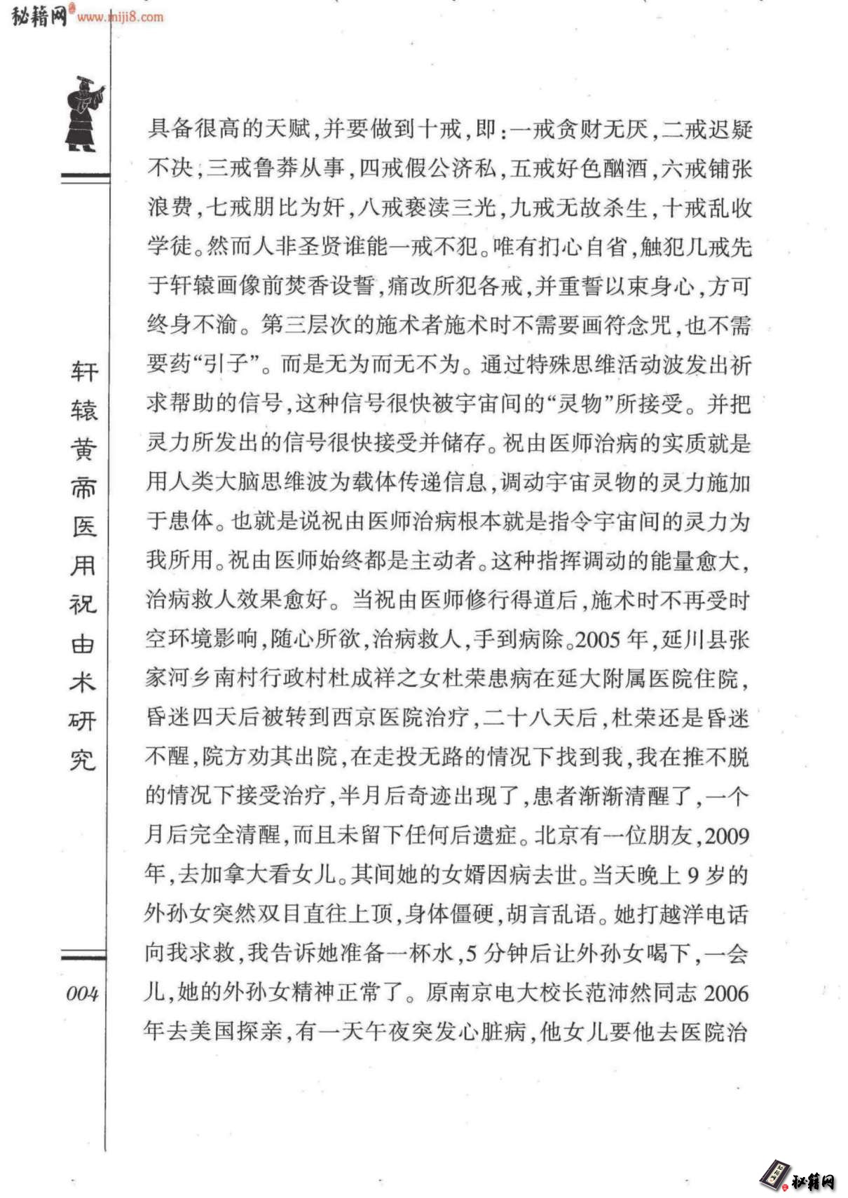 效性,因此才有如此强大的生命力,现仍有大量疑难杂症未被|由攻克,祝由术在这方面可发挥其独特的作用。李雄老师编著的|术《轩辕黄帝医用祝由术研究》一书,是其多年临床实践的总结。|研该书系统介绍了祝由术的发展历史,修炼、应用的要旨,为一|犹本不可多得的祝由术专著。在值该书即将付梓之际,谨以此为序。