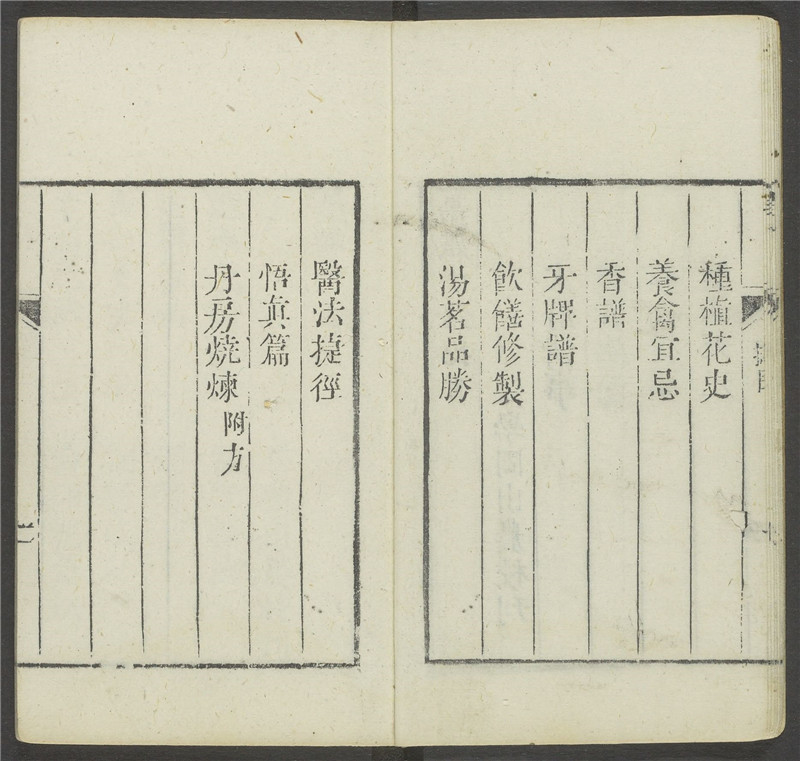 该书十四卷,卷目依次是:文府清事、博古绪余、饮膳集珍、汤茗品胜、医方捷法、艺术戏剧、推测历命、种植怡情、方外修真、房中秘药、丹方烧炼、香谱修制、禽畜宜忌、市语声嗽。从内容来看,卷三、卷四、卷八、卷十三等农学条目,较为实用,有一定科学价值。卷五、卷九、卷十等医学部分,亦多可采之处。卷十四“市语声嗽”,则辑录了大量的当时民间流传的歇后语和江湖切口,为研究方言和曲语保存了不可多得的资料。