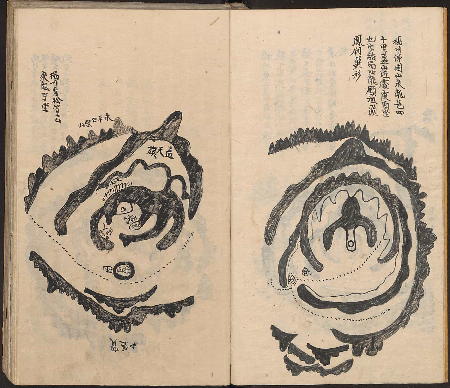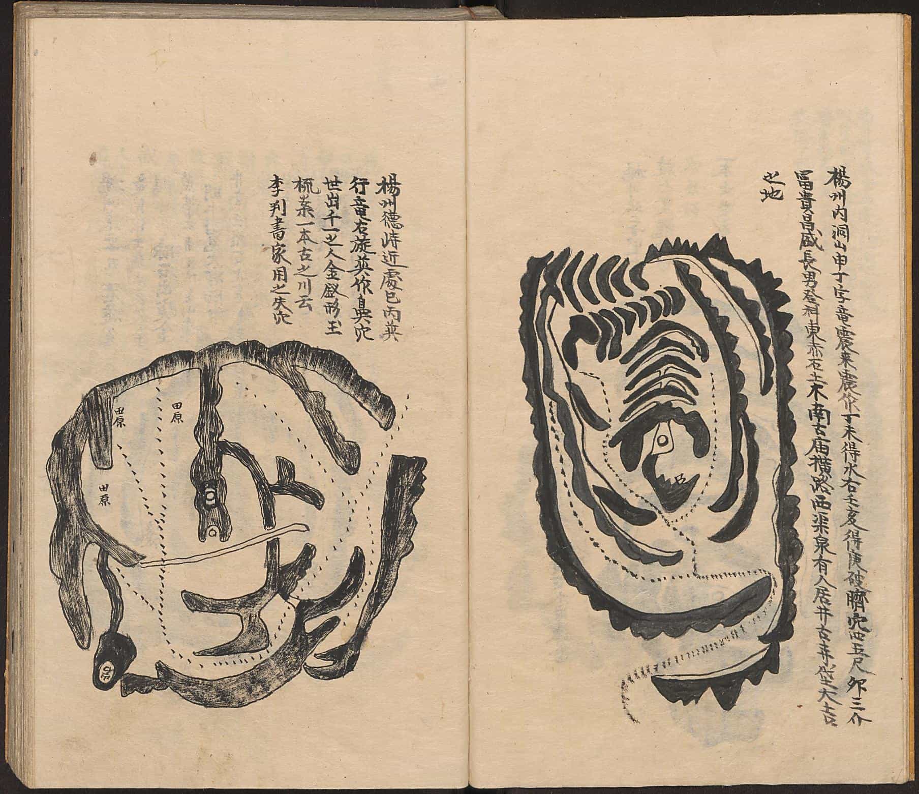 图形中,黑色区域是山脉,虚线表示水流。山脉上写有主要山峰的名称,有时沿着虚线水线写有“水口”、“来”、“去”等术语。岩石等用单线表示,并用“石”标记,“田原”表示田地的存在。偶尔会看到丙、午等指示方向的符号,表示二十四方位中的具体方向。