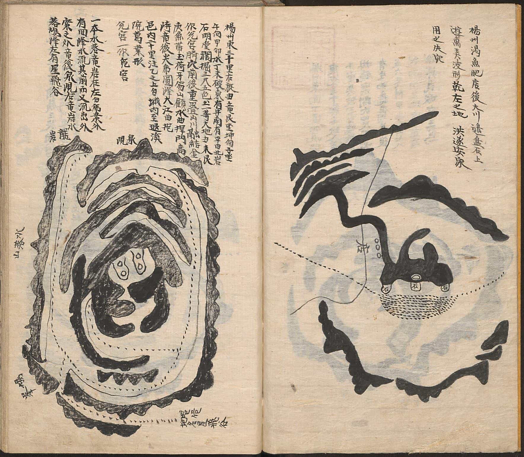 《巽坎妙诀》,清嘉庆时期抄本,是一本通过风水图解释韩国北汉山地区名胜的位置和特征的书,共介绍了218处名胜,地理图形187幅,其中还列举了中国已知的好地方的例子,并进行了对比说明。全本共97个双面,合计194页。