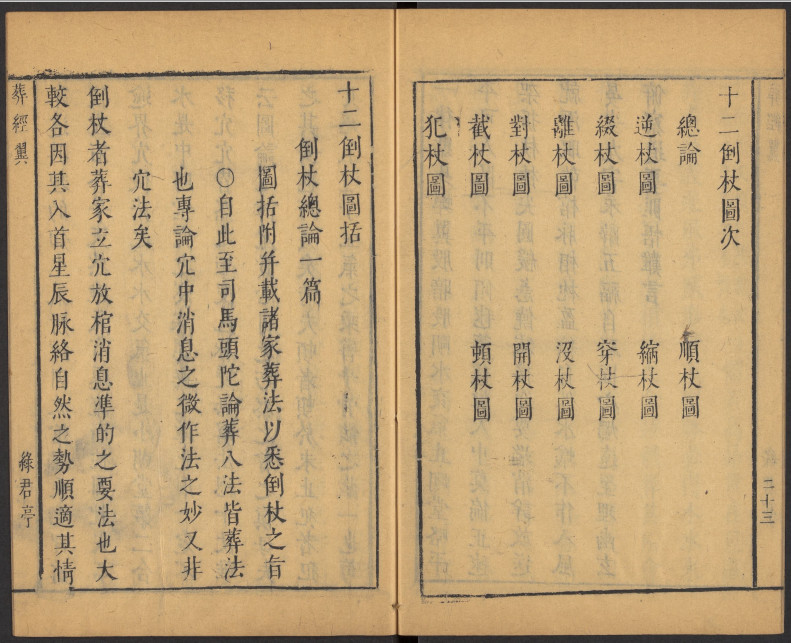 十二倒杖图次:顺杖图、逆杖图、缩杖图、缀杖图、穿杖图、离杖图、没杖图、对杖图、开杖图、截杖图、顿杖图犯杖图。