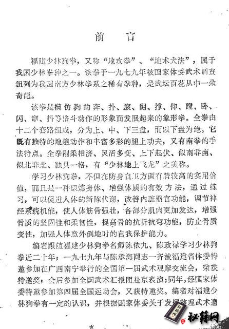 福建少林狗拳,又称“地攻拳”、“地术犬法”,属于我国少林拳种之一。该拳于一九七九年被国家体委武术调查组列为税园省方少林拳系之稀有拳种,是武坛百花丛中一朵奇葩。