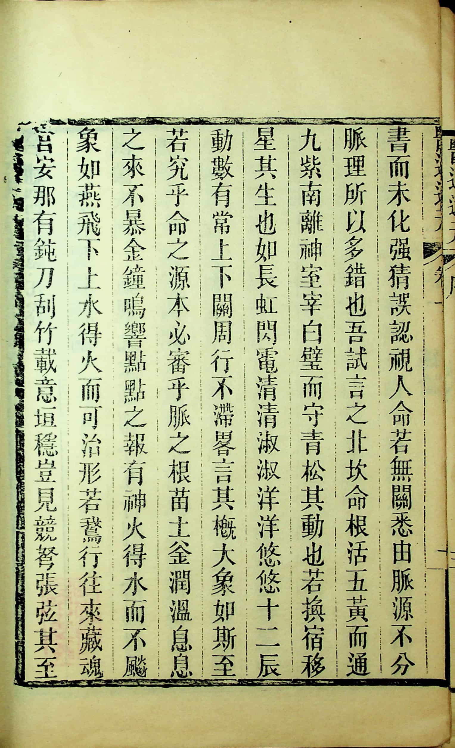 粤稽古来医家始以治病发药名世,终则入道登眞者代有其人,何则,人身百脉悉符天地奥玄其精於治病发药时,已把先天后天了然於心目,举人身上下关窍络绎,与百味之生克走守无不贯而彻之,是疗疾已得大道之度数及委心入玄宗而先天之妙道遂源流毕达今览,吕眞是书可想见其学之所从入亦由是焉,首透脉络关津百端病态药法千层,每归本於河洛寻将人身眞宰地上搜剔乎,盈虚剥复直合两大妙机,再与性命推究乎,无始之始无终之终,尽賅生天生地奥义,自首篇以迄终篇,实作仙作佛之门径,了凡入圣之阶梯,疾者读之而愈,愚者读之而慧,生智者读之而凡骨即换,眞可谓天人毕贯,三教统宗矣,人生百岁光阴,自当早寻出世妙法,倘令家家熟读,人人会通,安见疾之缠身,道之或坠耶,我佛梵音斯人罕达,今吕真著是书流传於世,靡特儒生得所益,即我佛道亦有助也,故特作数言於篇端。