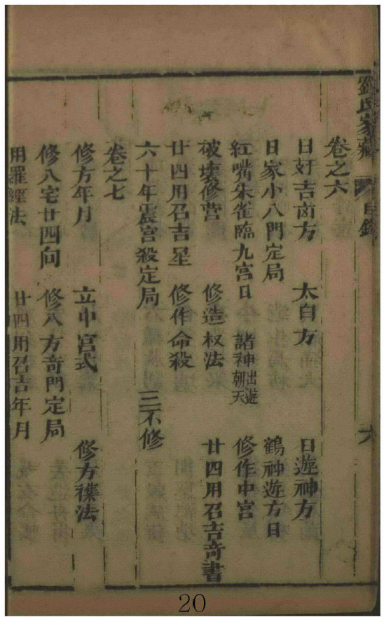 卷六日干支吉凶方、太白方、日游神方、八门定局、三不修等十五种择吉定例;