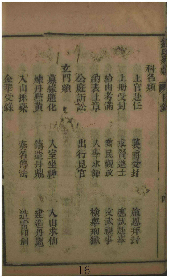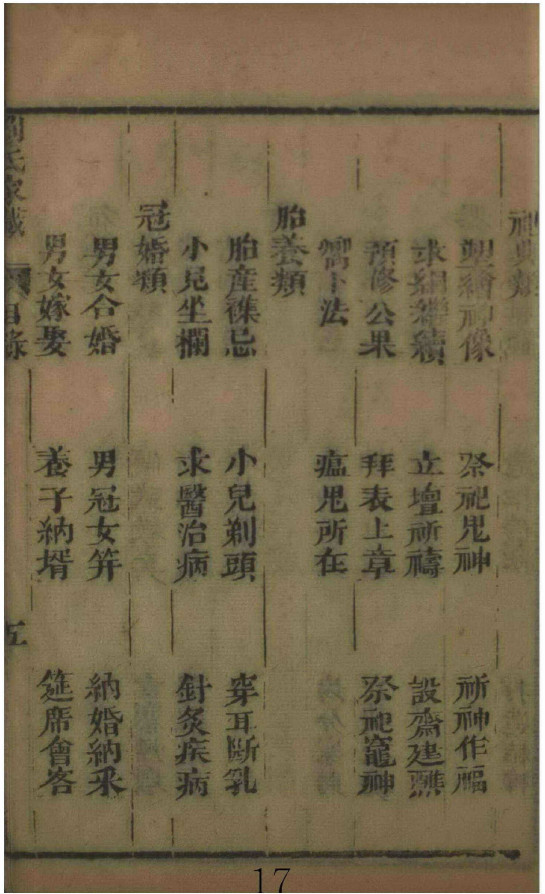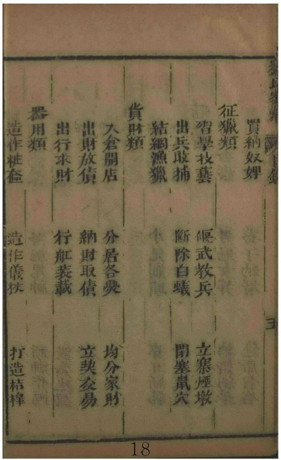 卷五为分类择吉指南,含科名类、玄门类、礼典类、胎养类、冠婚类、征猎类、货财类、器用类、种植类、六畜总忌等;