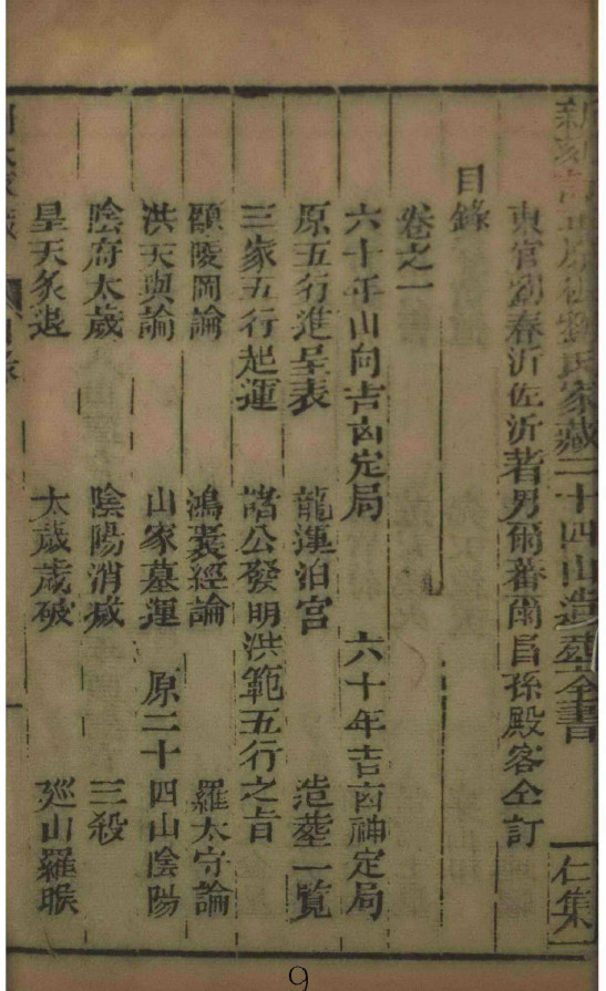 卷一论六十年山向吉凶定局、六十年吉凶神定局、原五行进呈表、龙运泊宫、造葬一览及诸家神煞、造葬秘论等;