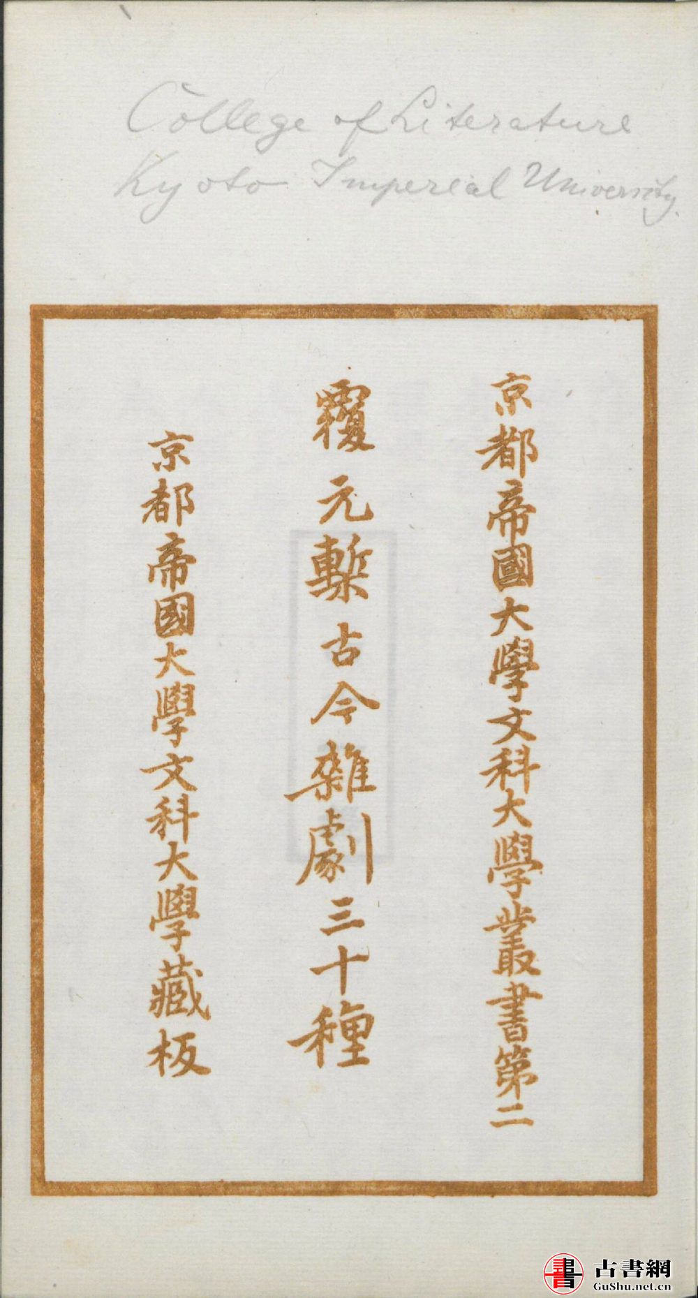 书名页题:京都帝國大學文科大學叢書第二、覆元槧古今雜劇三十種、京都帝國大學文科大學藏板