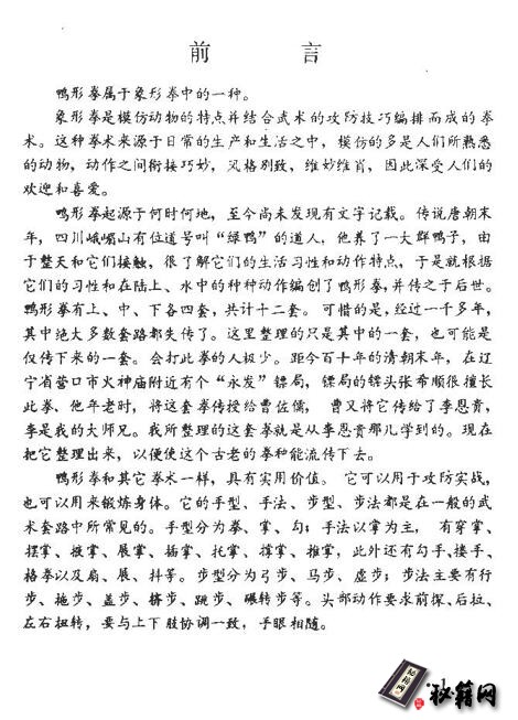 鸭形拳起源于何时何地,至个尚未发现有文字记载。传说唐朝末年,四川峨嵋山有位道号叫“绿鸭”的道人,他养了一大群鸭子,由于整天和它们接触,很了解它们的生活习性和动作特点,于是就根据它们的习性和在陆上、水中的种种动作编创了鸭形拳,并传之于后世。鸡形拳有上、中、下各四套,共计十二套。可情的是,经过一千多年,其中绝大多数套路都失传了。这里整理的只是其中的一套,也可能是仅传下来的一套。会打此拳的人极少。距今百十年的清朝末年,在辽宁省营口市火神庙附近有个“永发”锦局,锤局的锥头张希顺很擅长此孝、他年老时,将这套拳传授给曾佐儒,曹又将它传给了李恩责,这个古老的拳和能流传下去。